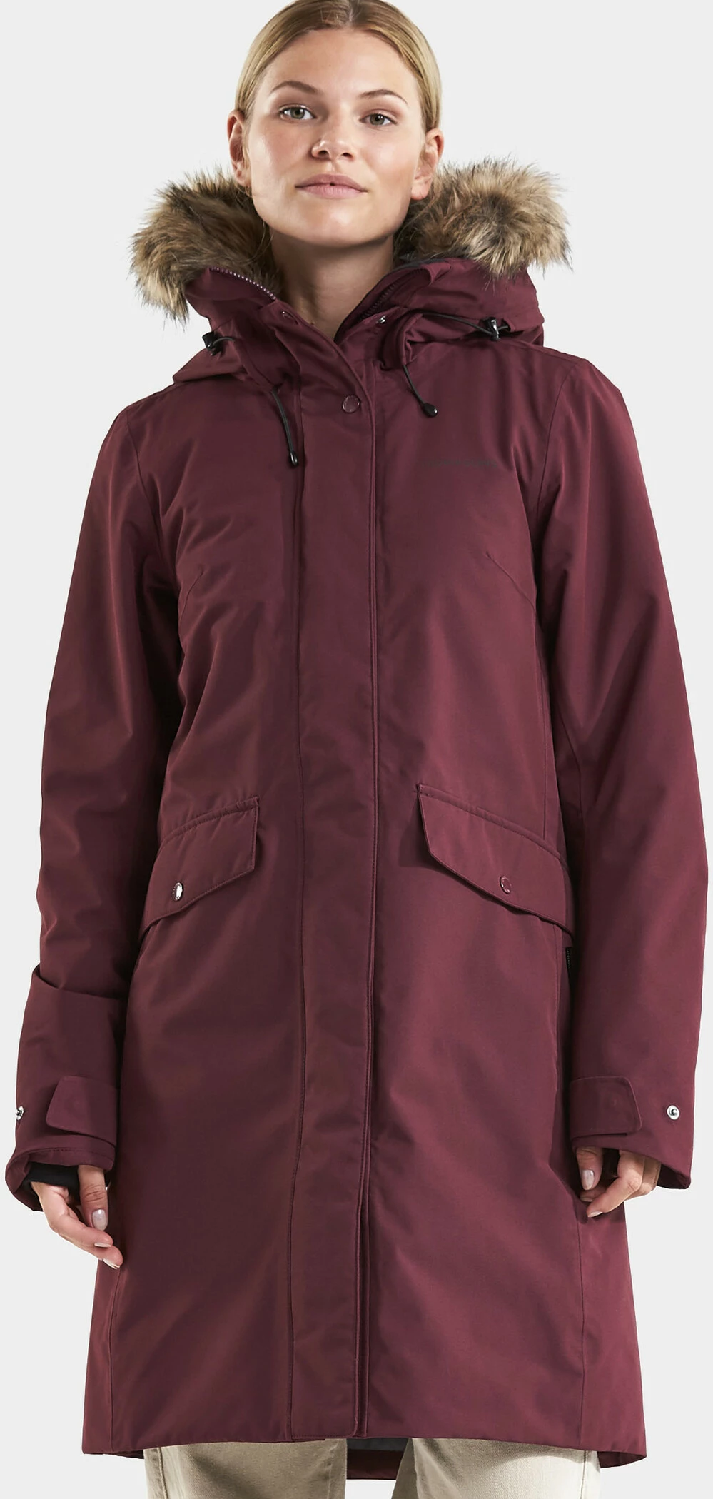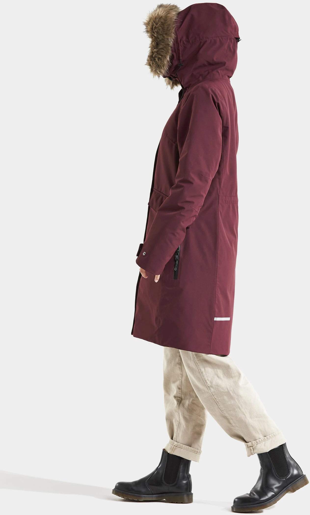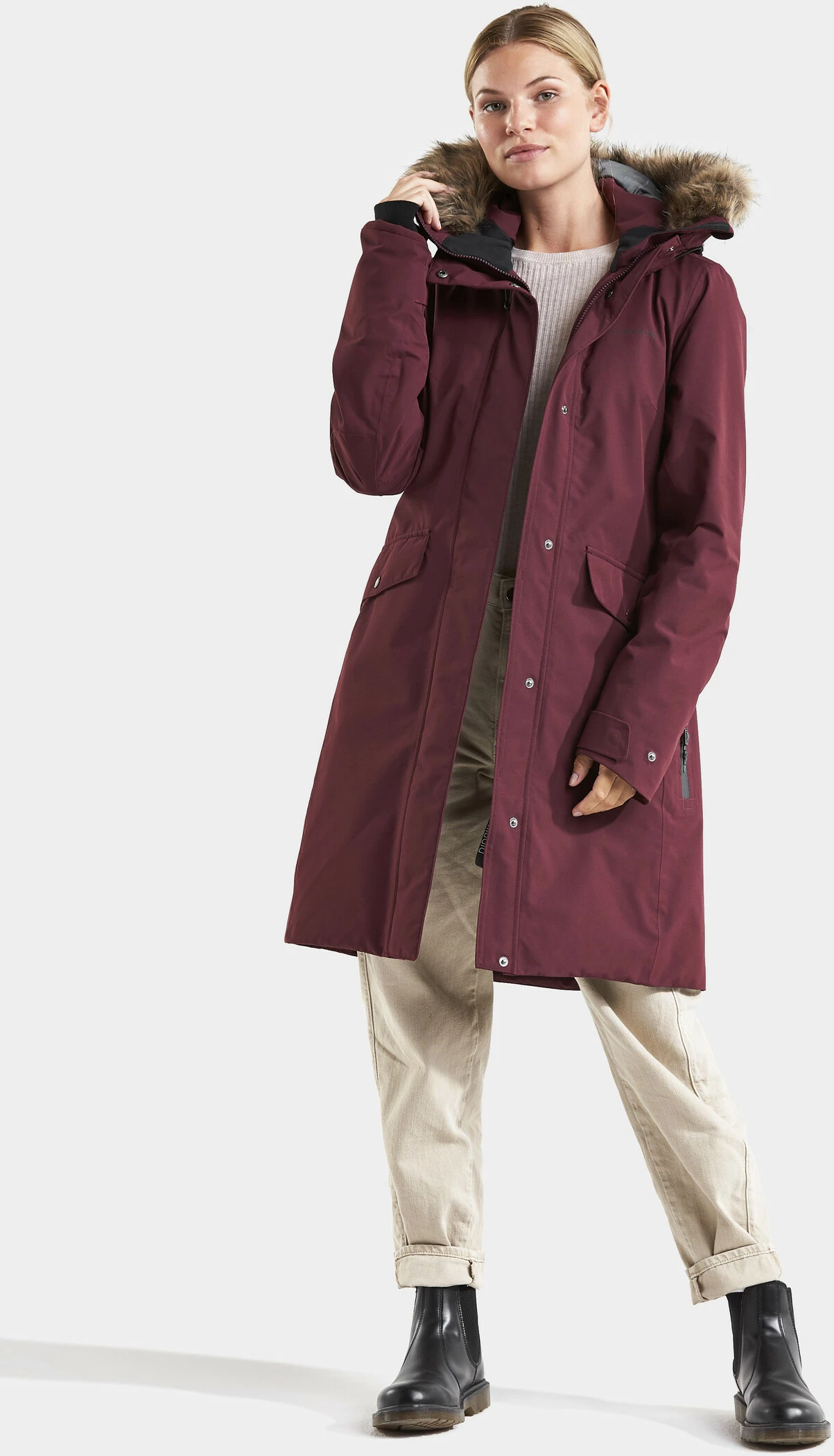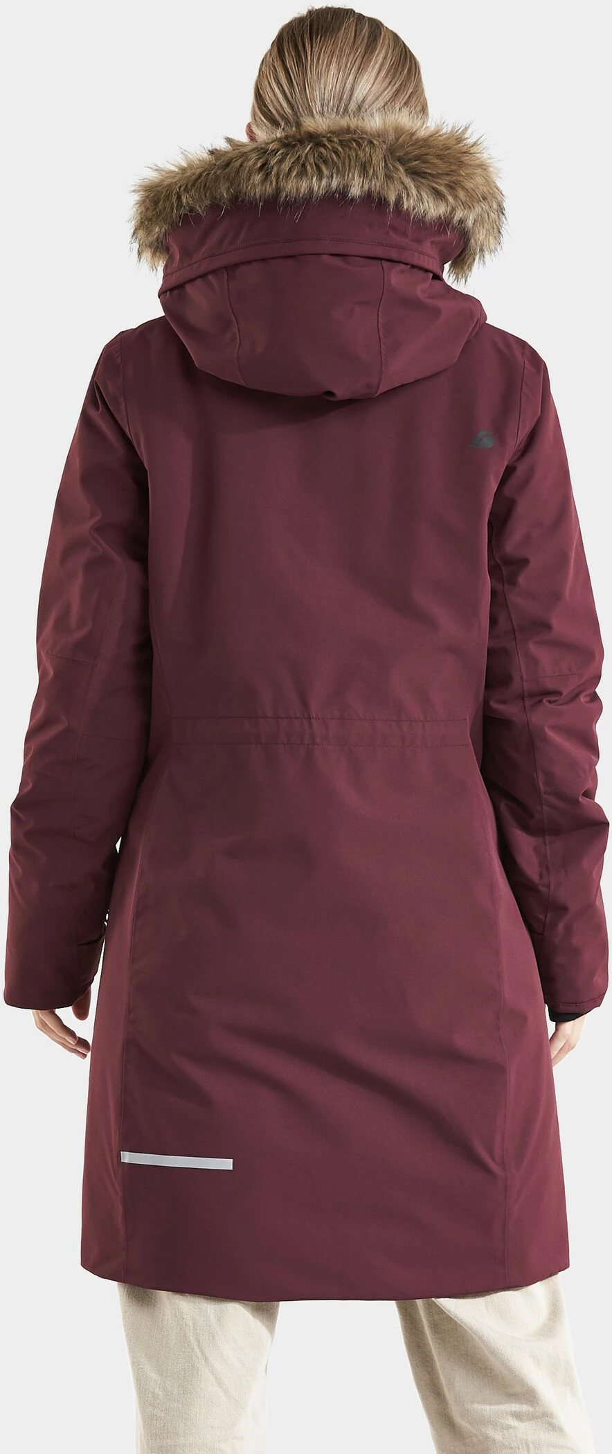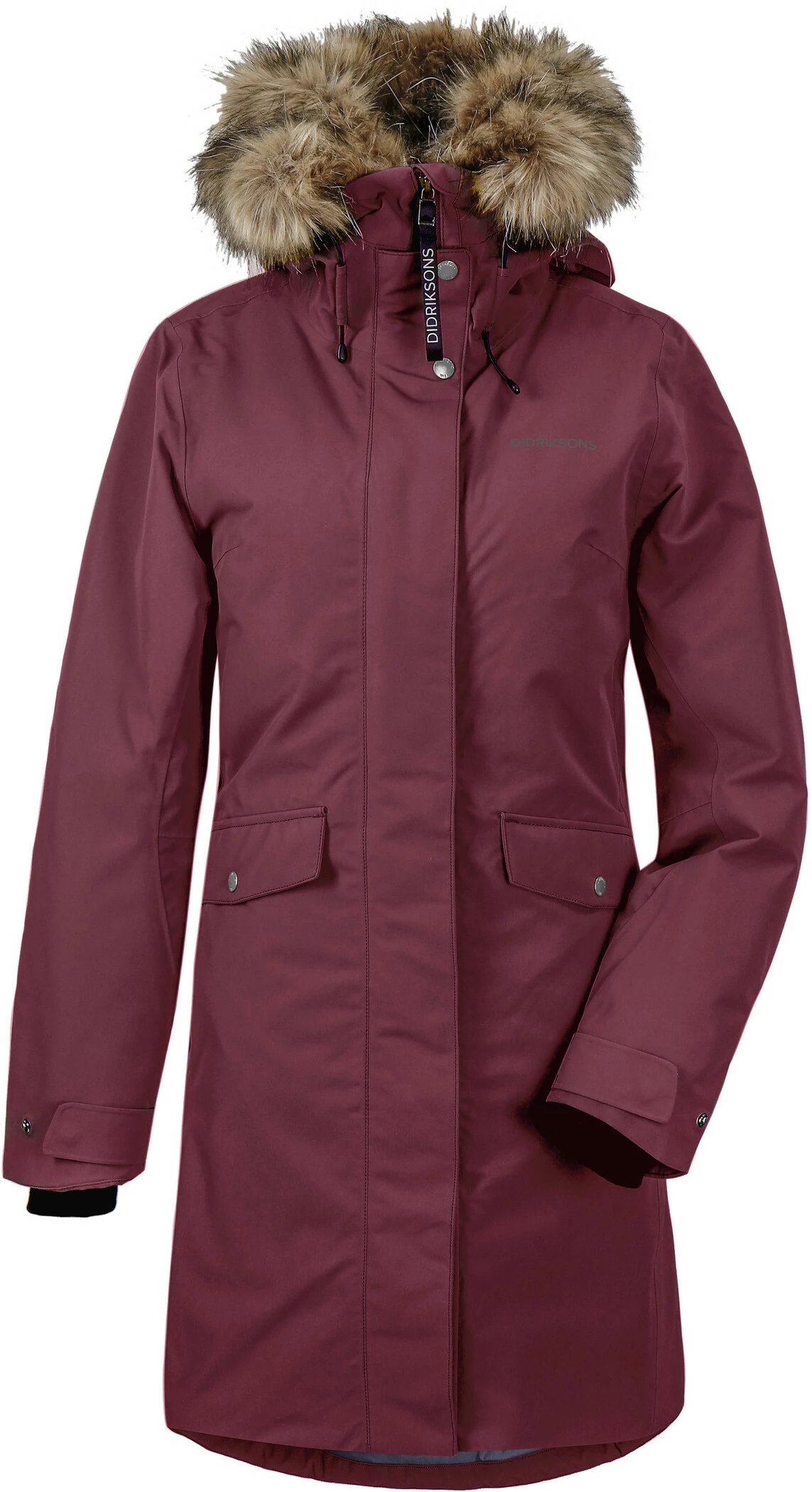 De klassieke, vrouwelijk gesneden Parka Erika houdt u aangenaam warm. Dankzij de gesealde naden is het model 100% wind- en waterdicht. Gemaakt van zacht polyester met een matte afwerking. Hoge kraag en verstelbare capuchon met afneembare rand van imitatiebont. 2-weg ritssluiting met windvanger, twee voorzakken met knoopsluiting en één zak met waterdichte ritssluiting. Twee binnenzakken, waarvan één met rits. De zoom, taille, manchetten en capuchon zijn verstelbaar. Geribde binnenmanchetten met duimgat. De rand van imitatiebont, de Didriksons opdruk en het Didriksons logo en de ritsflappen zijn reflecterend. Spin-geverfde voering. Spinverven bespaart water, energie en chemicaliën bij de productie. PFC-vrije impregnering.