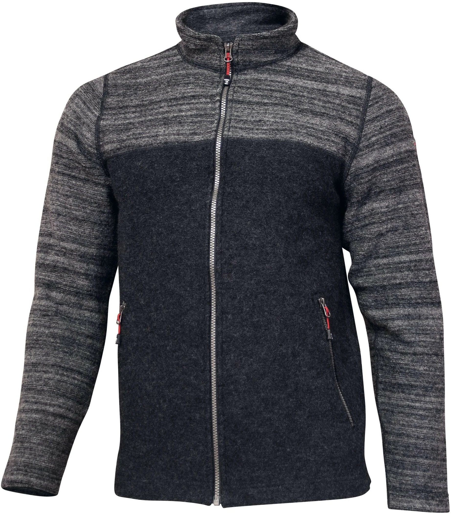 De Jon-Full Zip is een trui met een stevige wollen stof op het lichaam en wilde melangé op het juk en de armen. De stijl heeft een borduursel op de linker bovenarm. Gevormde rits aan de voorkant en in de zijzakken.