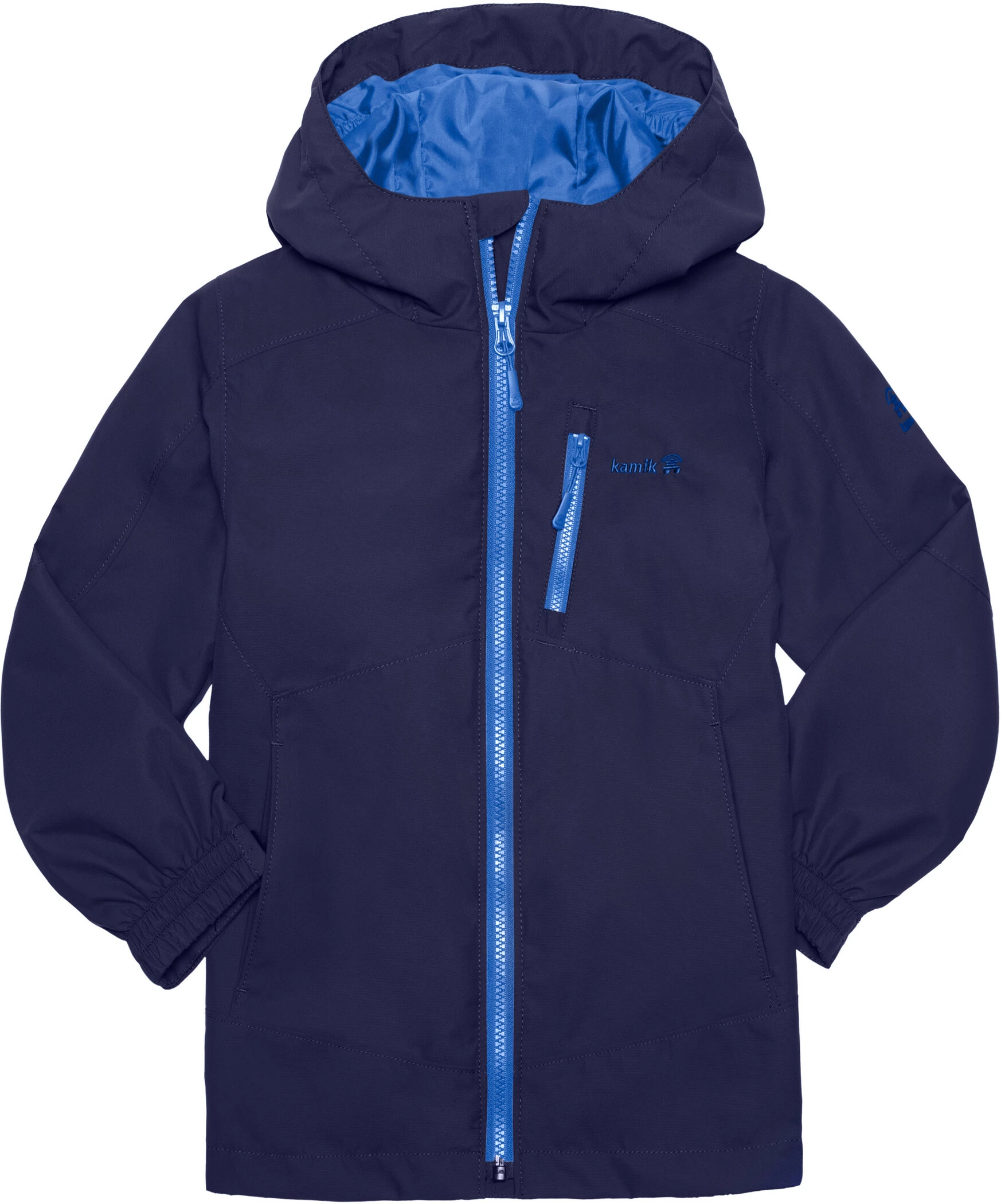 Een samenhangend systeem van componenten, waaronder windbestendige buitenstof met DWR coating, isolatie, voering en naadafdichting, exclusief voor Kamik kledingstukken.