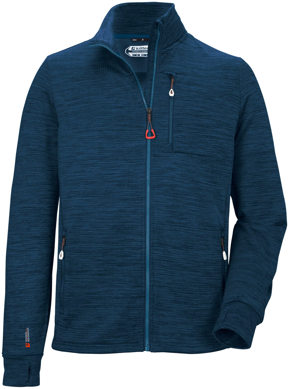The power stretch jacket from killtec in a melange look is a reliable companion through the cooler seasons. It is suitable as a transitional jacket or as a midlayer under the weatherproof jacket. The jacket is equipped with thumb loops at the cuffs, a stand-up collar and three practical zipped pockets. The chin guard on the front zip prevents the skin from becoming trapped. Contrasting colour details complement the sporty look.