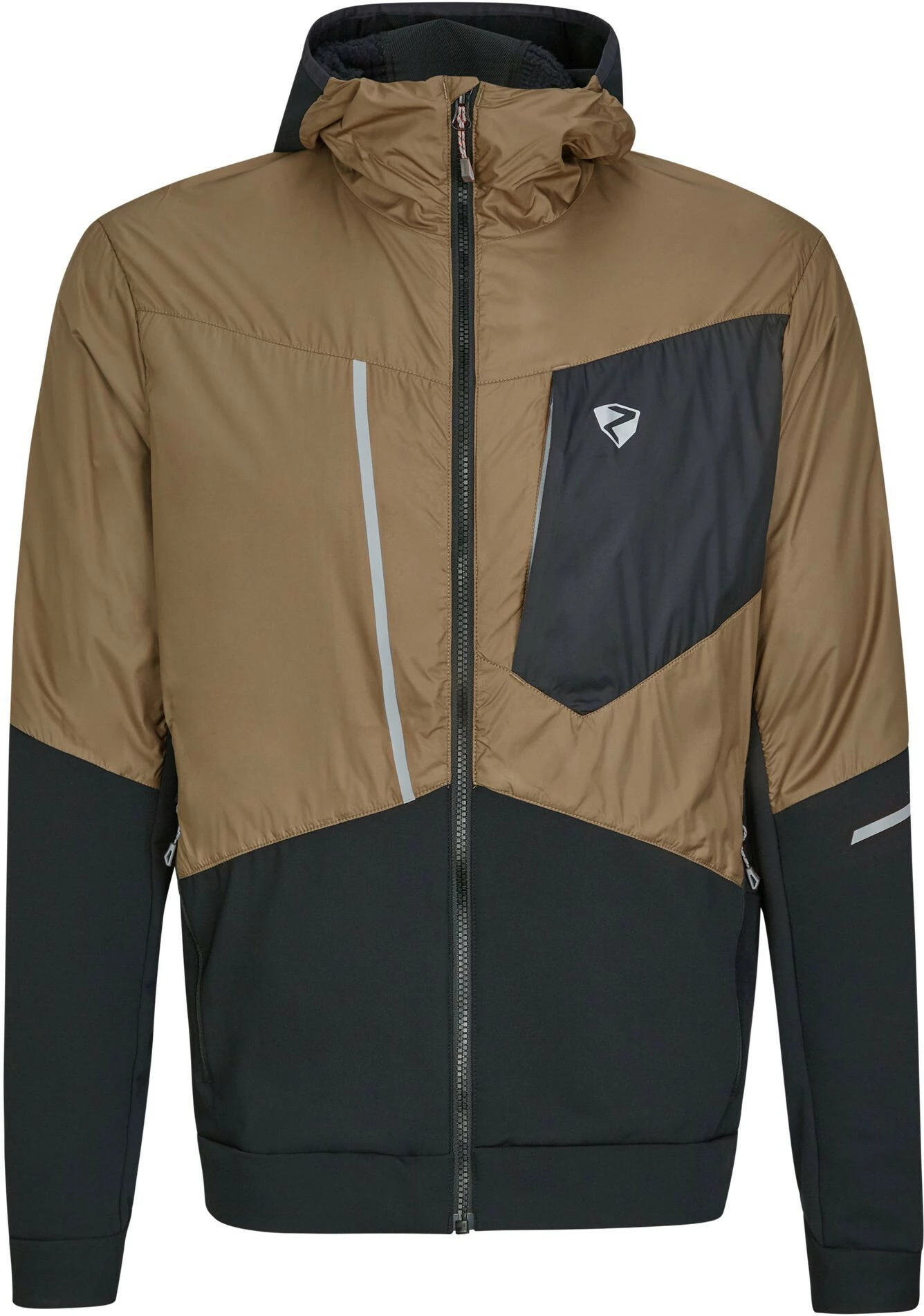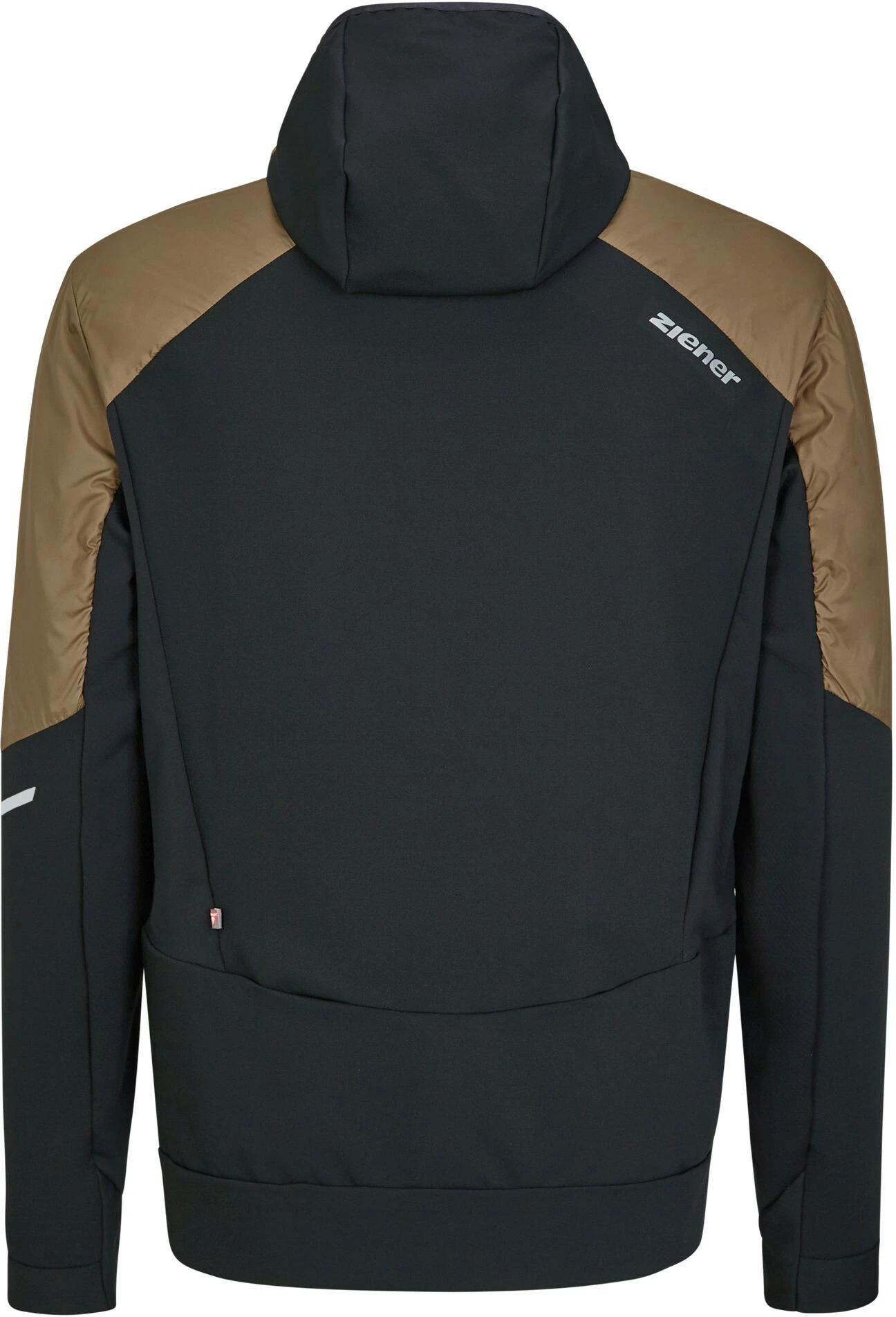 The functional ZIENER men’s active jacket NIKOLO MAN features small tabs for attaching to your belt loops, meaning that the jacket won’t move out of place when making your ascent or wearing a backpack. Thanks to its PrimaLoft ACTIVE inner lining, the elasticated jacket combines the thermal advantages of insulation with the versatility of functional fabrics. This makes it warm yet highly breathable. The lining contains recycled material – for a resource-saving approach to the environment. The breathable, windproof ZIENER WINDSHIELD material on the front also protects against windchill. Special inserts on the back ensure improved mobility and ventilation. The jacket is PFC-free thanks to its environmentally friendly waterproofing. Technical details such as a fixed hood and two zippered side pockets contribute to the functional comfort. The active jacket comes with reflective design elements.